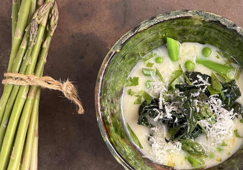 Creme af parmesan og konfiterede hvidløg med forårsgrønt