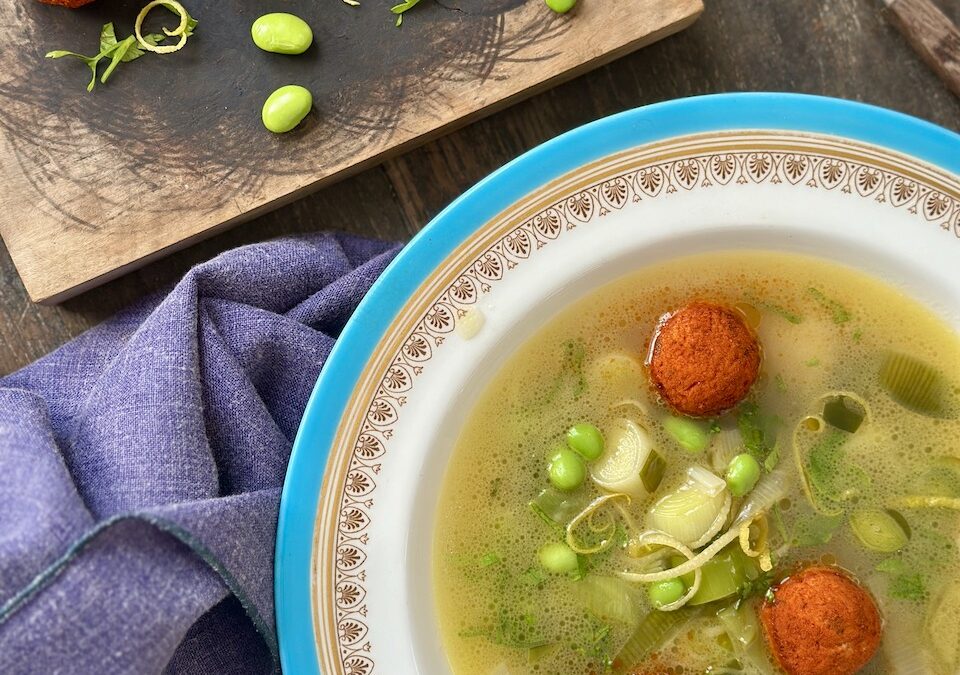 Klar suppemed porrer, hestebønner og riskugler