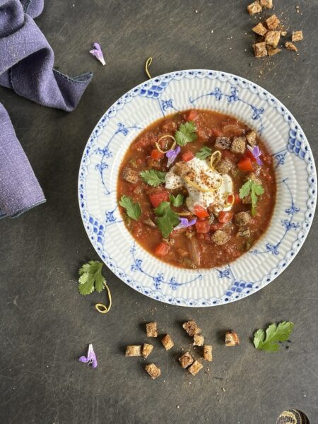 Server suppen i dybe skåle, og fordel croutonerne med ost ovenpå. Drys med timian og persille.