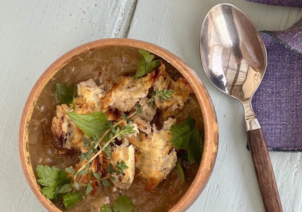 Klassisk fransk løgsuppe med croutoner og grillet ost