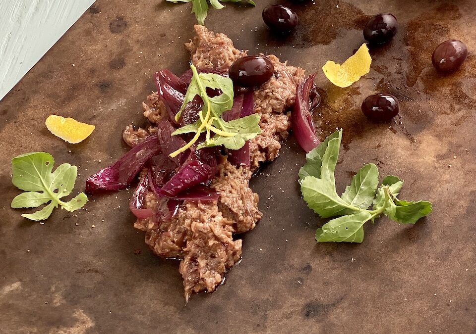 Tapenader forbindes især med den sydfranske puré af oliven, men faktisk har tapenader ikke deres navn fra oliven, men fra det provencalske ord for kapers, “tapenas”. I århundreder har man kendt til tapenader lavet med kapers og oliven, der blev stødt til en grovere puré og spist til brød. Vi foretrækker en mørk og kraftig tapenade lavet af sorte oliven som nicoise eller kalamataoliven, men ellers er hovedaktørerne kapers og sauterede rødløg. Rødløget giver sødme og syre og afbalancerer styrken fra de kraftigt smagende oliven.