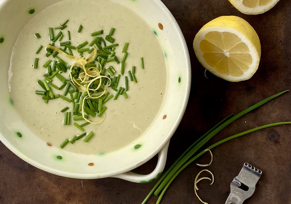 Tag suppen af varmen, og lad den køle af i 10 minutter, inden den blendes helt glat. Blend kun kort tid for at undgå, at suppens kon- sistens bliver sej pga. kartoflerne. Tilsæt creme fraiche, og smag suppen til med citronsaft, salt og peber. Sæt suppen i køleskabet, og server den kold drysset med fintklippet purløg, revet citronskal, dryp af ekstra jomfruolivenolie og friskkværnet sort peber.